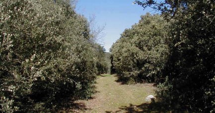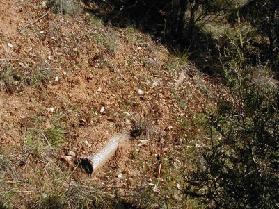 左:橋のたもと付近は、現在はこんな様子だ。橋にダイナマイトを仕掛けていたあたりだ。右:ブロンディとトゥコが担架を持って走り下りていた付近の現在の様子。