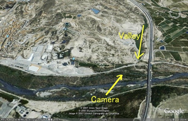 煩雑になるが、黄色い丸で囲った山は同一のもので、下の現地の写真の右の黒い部分は高速道路。